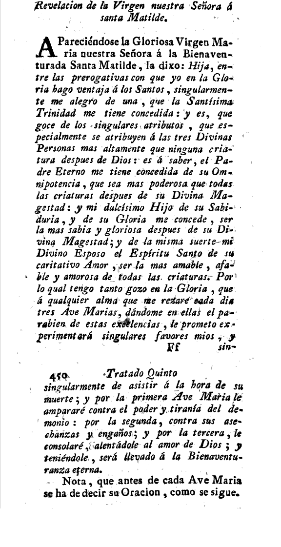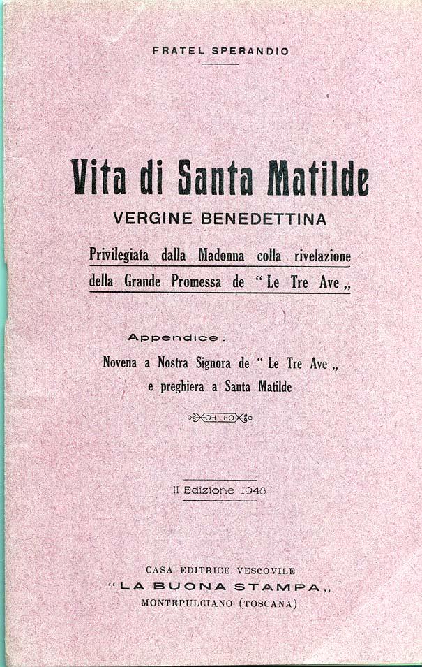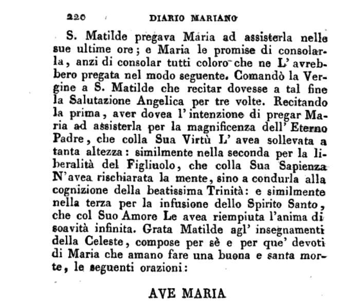 Santa Matilde di Hackeborn, era una monaca benedettina, morì sul finire del XIII secolo. Pensando con gran timore al momento della sua morte, chiese alla Madonna di non abbandonarla in quel momento estremo. Le apparve la Madre di Dio le diede una risposta consolantissia: “Sì, farò quello che tu mi domandi, figlia mia, però ti chiedo di recitare ogni giorno Tre Ave Maria: la prima per ringraziare l’Eterno Padre per avermi resa onnipotente in Cielo e in terra; la seconda per onorare il Figlio di Dio per avermi dato tale scienza e sapienza da sorpassare quella di tutti i Santi e di tutti gli Angeli; la terza per onorare lo Spirito Santo per avermi fatta, dopo Dio, la più misericordiosa”.