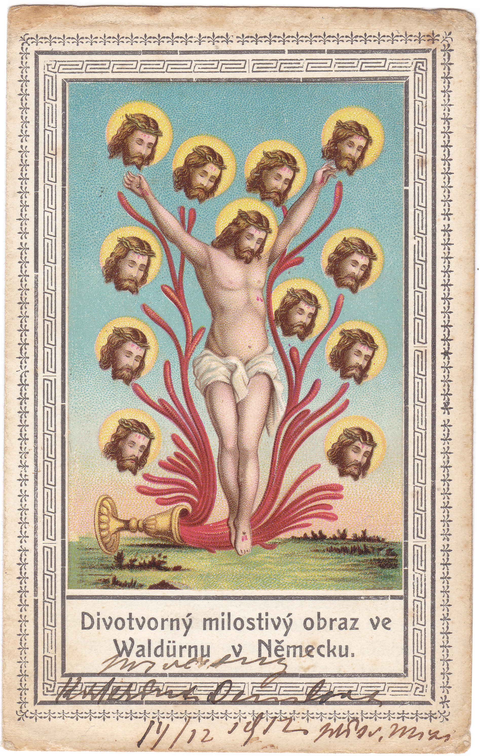 Nel 1330, a Walldürn, piccolo comune della Germania sud-occidentale, mentre un sacerdote di nome Heinrich Otto stava celebrando la messa, rovesciò per errore il calice con il vino consacrato e questo, macchiando il corporale, avrebbe prodotto un’immagine di colore rosso di Gesù crocifisso, circondata da undici teste uguali del Redentore coronato di spine.