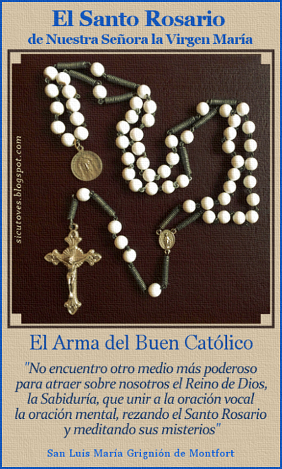Próximo a terminar este mes que la Piedad Católica ha dedicado al Santísimo Rosario de la Virgen, procuremos rezarlo cada día, siguiendo el deseo continuo de Nuestra Señora, especialmente en Sus Apariciones en Fátima, donde aseguró que con él alcanzaríamos “la paz del mundo y la conversión de los pecadores”. Teniendo presente este pedido de Nuestra Santa Madre, comprende cuán importante es rezar bien Su Rosario: intenta rezarlo con pausa, pronunciando bien las oraciones, con atención y cariño, pues se dirigen a la que es tu Madre pero también tu Señora. Cuando tomes el Rosario en las manos y te santigües para rezarlo, olvida las prisas y mete todas las preocupaciones que te aturden entre sus cuentas.