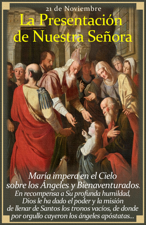 Habiendo celebrado el 8 de Septiembre la Natividad de la Virgen maría y cuatro días después Su Santísimo Nombre, honramos hoy la Presentación en el Templo de aquella Niña de bendición. Esas tres fiestas del Cielo Marial son como un eco del Ciclo Cristológico, que celebra también el Nacimiento de Jesús, Su Santísimo Nombre y Su Presentación en el Templo el día de la Candelaria.