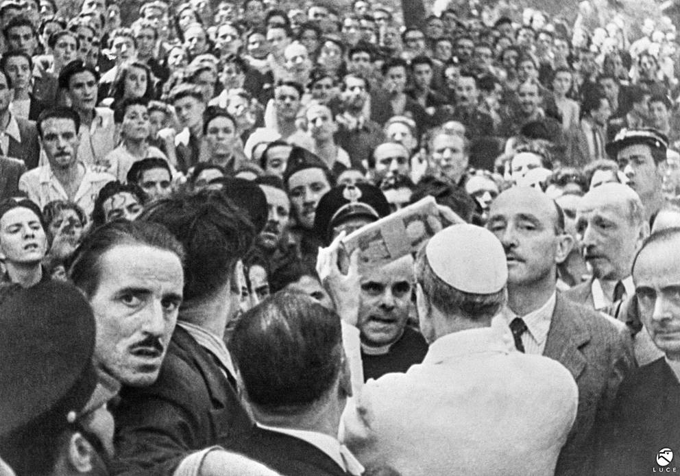 Pio XII distribuisce danaro e aiuti il 13 agosto 1943 al Laterano, durante il secondo bombardamento di Roma