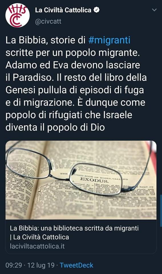 La sudditanza dei modernisti al pensiero mondano e alle politiche di potentati e poteri secolari (noti ed occulti) supera sempre più spesso le soglie a un tempo del ridicolo e del sacrilego. Così ad esempio Civiltà Cattolica, la un tempo gloriosa rivista dei Gesuiti, pubblica un articolo (vedi qui) il cui abstract è in foto: le Sacre Scritture – da Adamo agli Apostoli passando per il “mito” (sic!) dell’Esodo – altro non sarebbero se non storie di migranti, di rifugiati, di profughi.