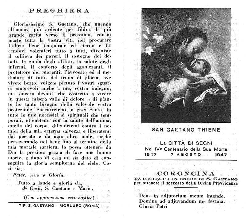 San Gaetano Thiene nacque a Vicenza nell’ottobre del 1480. Laureato in utroque jure non esercitò mai l’avvocatura, ma preferì intraprendere la vita religiosa: nel 1504 ricevette la tonsura e da chierico si trasferì a Roma nel 1506. Fu protonotario apostolico e membro della Curia Romana, stimatissimo da Giulio II allora regnante. Per dispensa di Leone X, nel settembre del 1516 ricevette gli ordini minori e maggiori, fino al sacerdozio il 30 settembre. Durante la prima messa, celebrata in Santa Maria Maggiore, gli apparve la Vergine che gli pose il Bambino Gesù fra le braccia. Nel 1523 assieme a Gian Pietro Carafa (futuro papa Paolo IV) fonda i Chierici Regolari detti Teatini da Teate (nome latino di Chieti, di cui il Carafa era Vescovo), approvati l’anno dopo da Clemente VII. Morì a Napoli, stremato dall’attività apostolica – non ultimo lo zelo contro gli eretici che infestavano quel regno, soprattutto Valdesiani -, il 7 agosto 1547. Insigne per la santità della vita apostolica e per i miracoli, Urbano VIII gli decretò il culto dei Beati l’8 ottobre 1629; venne proclamato santo da papa Clemente X il 12 aprile 1671. Pio XII lo definì «acceso apostolo del divino Amore e campione insigne dell’umana carità». Le sue spoglie sono riposte onorevolmente nel suo Santuario di Napoli (che lo venera come Patrono) nella cripta di San Paolo Maggiore.