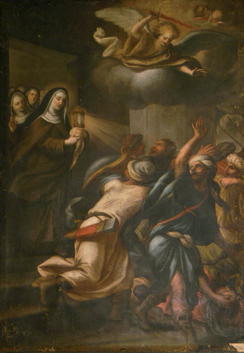 Il Serafico Patriarca Francesco, come si sa, nel 1219 volle andare in Egitto al seguito dei Crociati e si presentò allo stesso Sultano al-Malik al-Kāmil per predicare a lui e ai suoi, seguaci del falso profeta Maometto, “il Dio uno e trino e il Salvatore di tutti, Gesù Cristo” (vedi qui). Similmente ed in modo egualmente poco ecumenico, ebbe a confrontarsi coi Maomettani (soldati saraceni al soldo dell’empio e più volte scomunicato Federico II di Svevia), nel 1240, la sua prima discepola, santa Chiara “prima pianta delle Povere Donne dell’Ordine dei Minori”, come ci racconta il beato Tommaso da Celano.