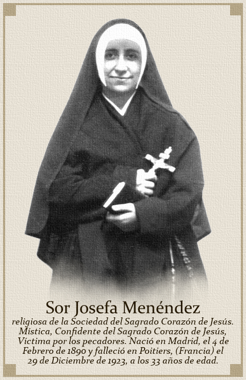 Sor Josefa Menéndez nació en Madrid el 4 de Febrero de 1890, en un hogar modesto pero muy cristiano, bien pronto visitado por el dolor. La muerte del padre, dejó a la jovencita como único apoyo de su madre y de dos hermanas, a las que sostenía con su trabajo.