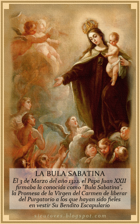 Tal día como hoy, el 3 de Marzo del año 1322, el Papa Juan XXII firmaba la conocida como “Bula Sabatina”, para refrendar a través de ella, aquella disposición del Cielo que a él mismo le fuese revelada por Nuestra Señora; consiste en la Promesa de la Virgen Purísima de liberar del Purgatorio el Sábado siguiente a la muerte de cuantos devotos Suyos, hayan sido fieles en vestir el Santo Escapulario, que además hayan observado la Santa Ley de Dios, aparte de rezar a diario el Santo Rosario y cumplir con la castidad según el estado.