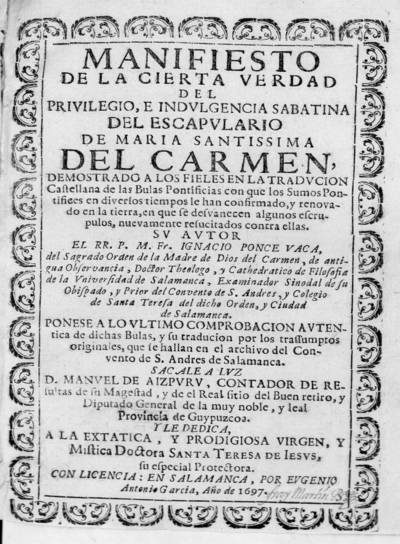 Documento original de 1697, por el cual se recordaba a los fieles la veracidad de la Bula Sabatina, escrita por por el Padre Ignacio Ponce Vaca, del Carmelo de la Antigua Observancia