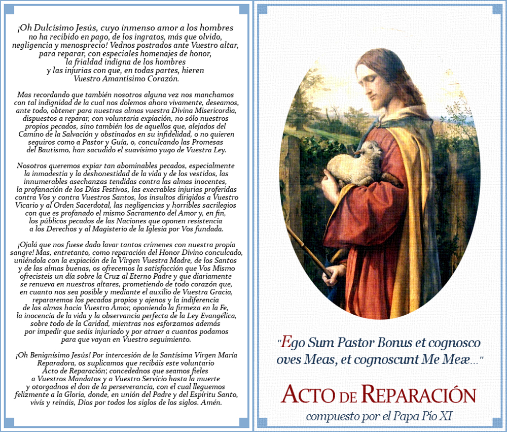 ¡Ojalá que nos fuese dado lavar tantos crímenes con nuestra propia sangre! Mas, entretanto, como reparación del Honor Divino conculcado, uniéndola con la expiación de la Virgen Vuestra Madre, de los Santos y de las almas buenas, os ofrecemos la satisfacción que Vos Mismo ofrecisteis un día sobre la Cruz al Eterno Padre y que diariamente se renueva en nuestros altares, prometiendo de todo corazón que, en cuanto nos sea posible y mediante el auxilio de Vuestra Gracia, repararemos los pecados propios y ajenos y la indiferencia de las almas hacia Vuestro Amor, oponiendo la firmeza en la Fe, la inocencia de la vida y la observancia perfecta de la Ley Evangélica, sobre todo de la Caridad, mientras nos esforzamos además por impedir que seáis injuriado y por atraer a cuantos podamos para que vayan en Vuestro seguimiento.