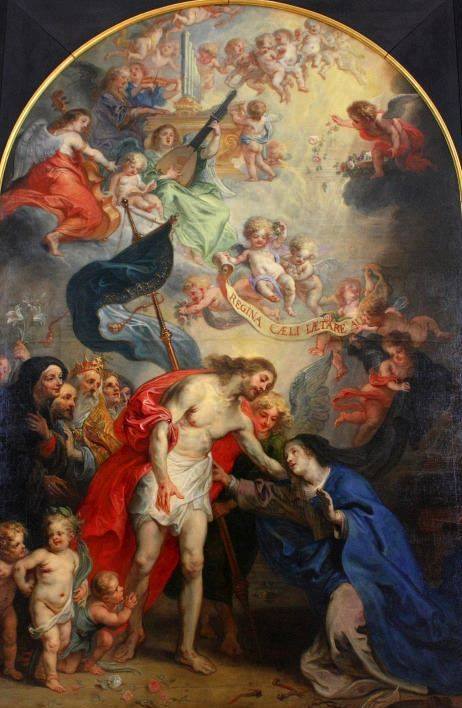 Secondo la tradizione questa antifona mariana, che sostituisce l’Angelus dal Sabato Santo al Sabato precedente la Domenica della Santissima Trinità, venne cantata dagli Angeli per annunziare a San Gregorio Magno che allora stava conducendo una processione penitenziale la cessazione di una fiera pestilenza (vedi qui). Già recitata nella Chiesa – basti pensare alla menzione che ne fa l’Alighieri nel XXIII canto del Paradiso – e copiosamente arricchita di sante indulgenze, fu consacrata come antifona del tempo pasquale da Benedetto XIV.