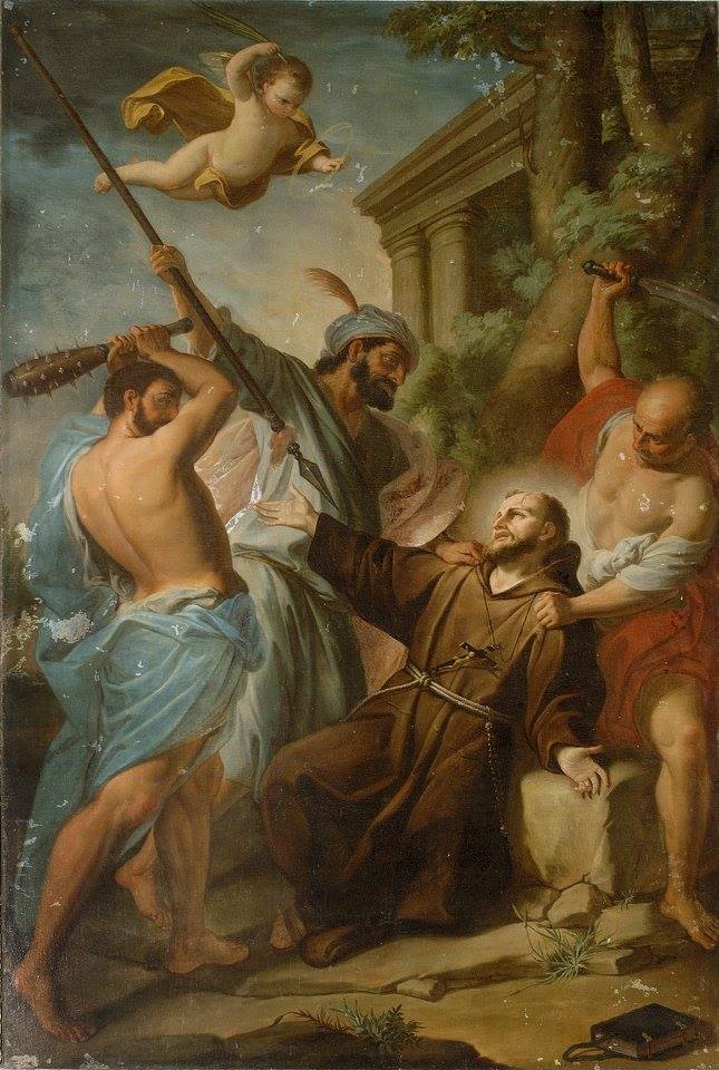 Trionfavano i Barbari per la strage fatta del Martire onde strascinando al luogo della carneficina alcuni Cattolici urtando co’ piedi nel sagro Cadavere e calpestandolo: “Ecco – dicevano – chi poco fa ci voleva tutti Papisti. Ecco qui chi voleva distruggere la nostra Religione“. Proseguendo nello schernirlo e schiacciarlo come un vil verme.