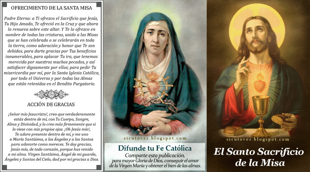 El Cuerpo y la Sangre de Cristo son necesarios para la salvación eterna. Privados de la Sagrada Comunión es necesario hacer a menudo Comuniones Espirituales y así aumentar en nuestra alma el deseo de recibir a Jesús Sacramentado; aprovecha y procura hacer Comuniones Espirituales POR TODAS AQUELLAS ALMAS que no comulgan o lo hacen mal … Para leer más… https://sicutoves.blogspot.com/2019/09/la-comunion-espiritual-amoroso-abrazo.html?m=0