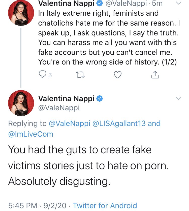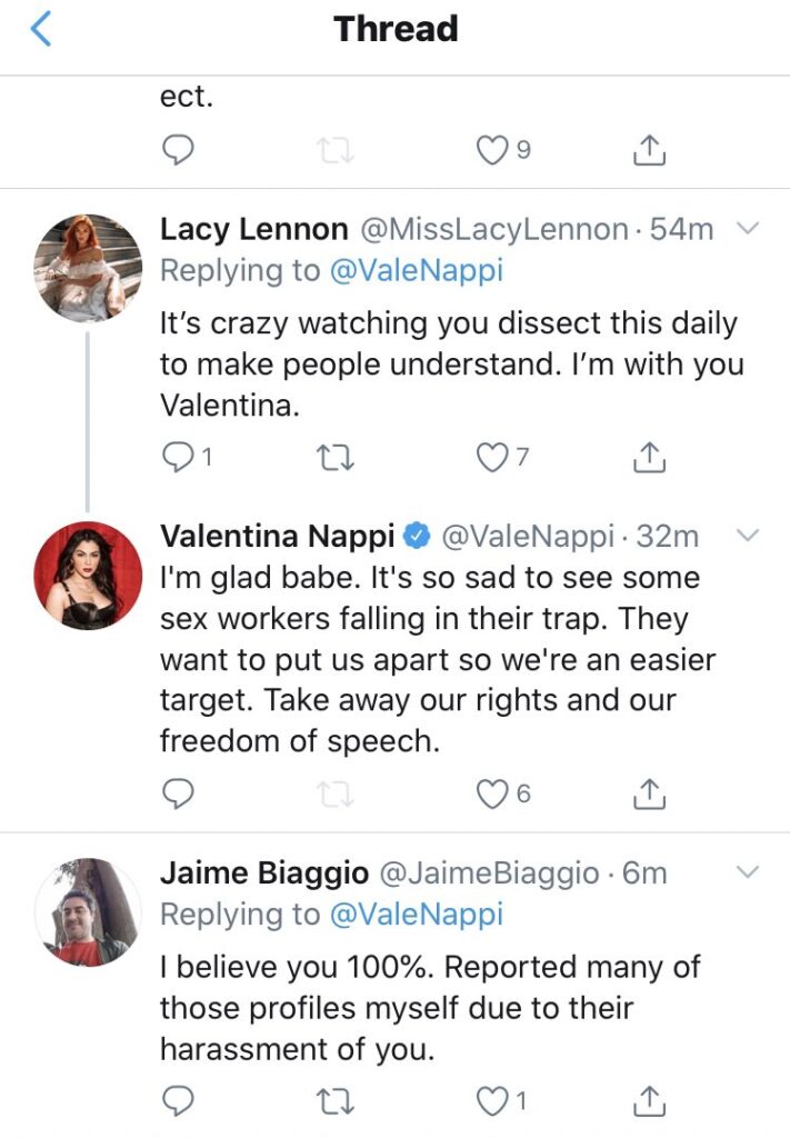 Come Lacy Lennon, modella per adulti (il nome con cui si qualificano le pornografe) statunitense di prima fascia che ha scritto «è assurdo vederti farti in quattro tutti i giorni per far capire alle persone la verità. Sono con te Valentina.»